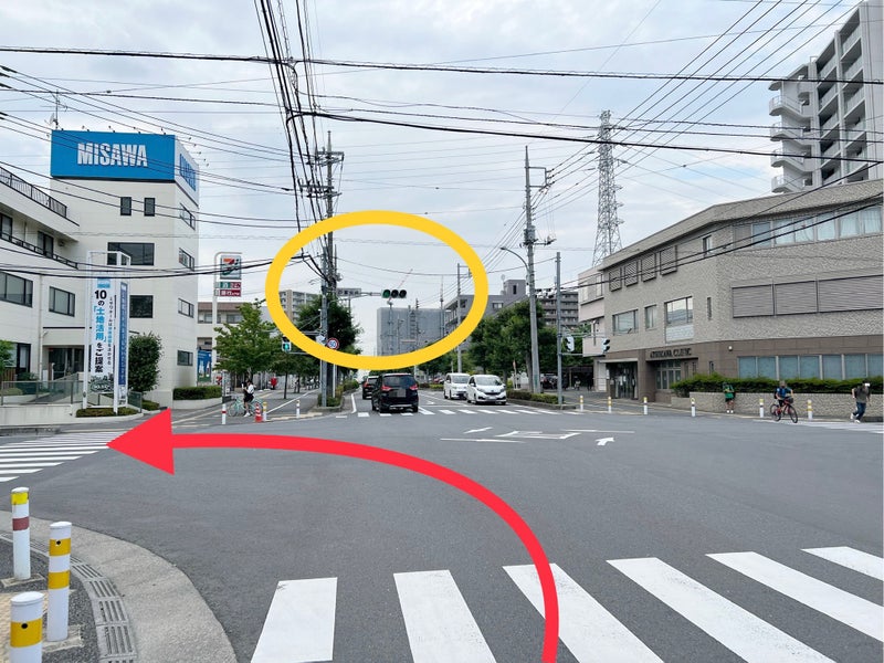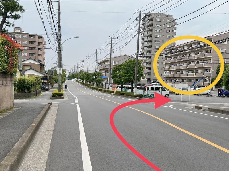10.ひとつめの十字路を右折します。サロンの入るマンションが見えてきました。(黄色い丸で囲んだ建物です)