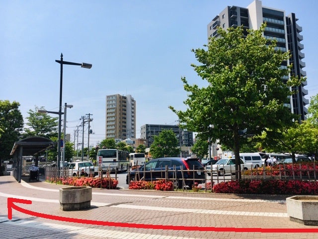 6.階段を上りきると駅前のロータリーに出ますので、そのまま左方向に進みます。タクシー乗り場が見えます。
